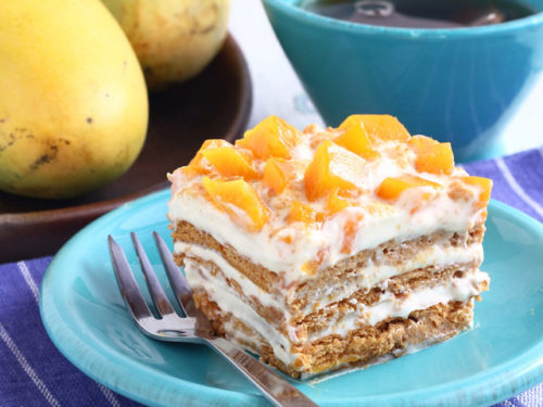 - Arrange 12 pieces of Graham Crackers in the glass dish. Then top with the cream mixture. Cover first layer with mango.